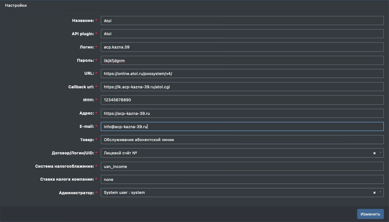 | Callback url | Ссылка на личный кабинет биллинга, именно в таком виде | https://lk.acpkazna39.ru/atol.cgi |
