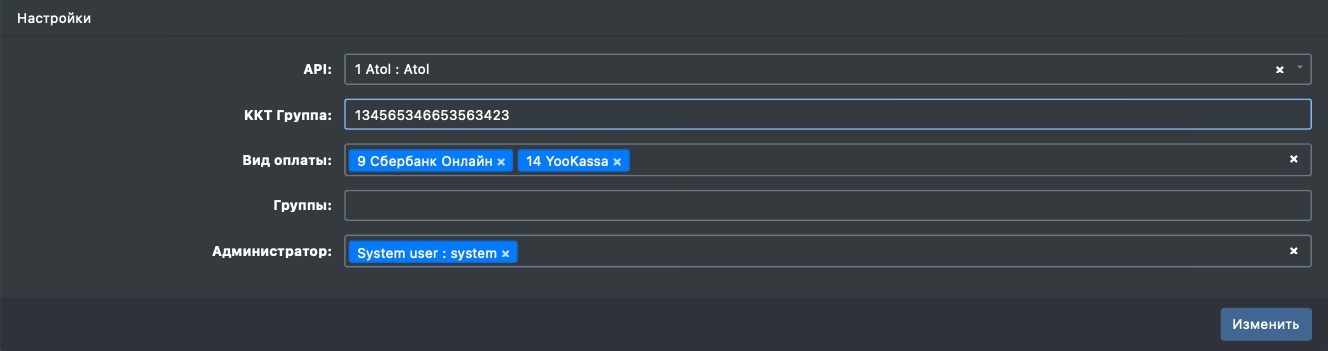 | Администратор | Список администраторов, у которых, при добавлении платежа, происходит отправка чеков | Суперадмин, Полуадмин |