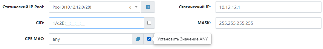 $conf{INTERNET_CID_FORMAT} = '^(([0-9A-F]{2}[:]){5}([0-9A-F]{2});?){1,}$';При заполнении поля CID будет выполняться проверка формата. Также визуально в поле будет маска для ввода значения. Для установки значения ANY нужно включить чек-бокс справа от поля