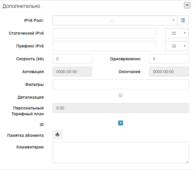 | IPv6 Pool | Автоматическое заполнение поля "Статический IPv6" из указанного пула адресов, если не указано поле "Статический IPv6", также автоматически заполняет IPv6 префикс согласно формуле пула адресов |