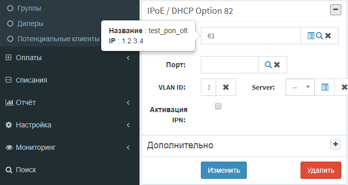 Также нужно прописать параметры Сервер доступа и Порт в панели IPoE/DHCP Option 82 сервиса Internet для закрепления ONU/порта за абонентом.