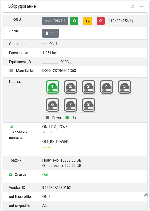 Панель оборудования, когда абонент привязан к ONU. Отображает информацию про эту ONU. | Панель "Оборудование", когда абонент привязан к порту на коммутаторе/маршрутизаторе. Отображает информацию про оборудование и этот порт. На поддерживаемых моделях оборудования есть возможность запускать команды на оборудовании прямо с этой панели. Если на порту есть ошибки и в SNMP шаблоне оборудования есть значения OID - будет выведена кнопка "Сбросить" ошибки. В резиновых полях есть возможность выбрать скорость порта, которое покажет через слеш скорость порта/пропускную способность порта: 100 Mbps/100 Mbps |