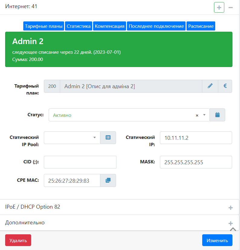 | Статус | Статус услуги абонента. Также можно указать дату блокировки аккаунта в меню расписания. Если статус отличается от активно, тогда сессия не поднимается или поднимается только в гостевом режиме, при включенной функции гостевой режим.