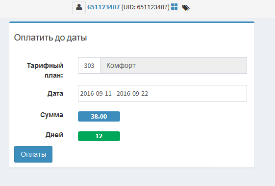 | Оплата | Оплатить до определённого числа для тарифов с дневной и месячной распределённой абон. платой |