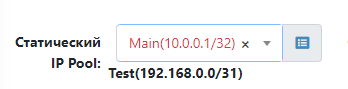 | Статический IP Pool: | Автоматическое заполнение поля IP из указанного пула адресов, если не указано поле IP (или равно $conf{INTERNET_DEFAULT_IPV6_POOL} - устанавливает ID существующего статического пула по умолчанию для IPv6 Если в пуле осталось меньше 4 свободных ip-адресов, то он подсветиться желтым цветом. Если не осталось свободных - красным. |