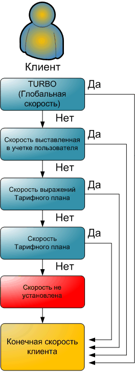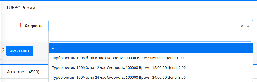 После включения модуля, в пользовательском интерфейсе появляется меню TURBO Режим. В этом меню пользователь может выбрать необходимый тариф (скорость/время на которое предоставляется данный режим). Система сразу открывает доступ пользователю на запрошенной скорости. По истечению времени система понижает скорость до скорости тарифного плана.