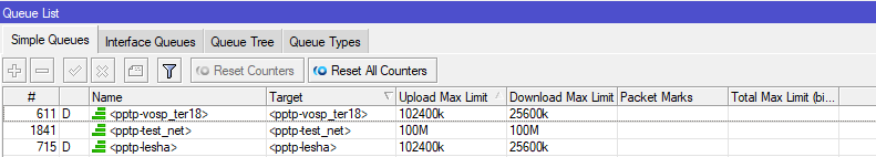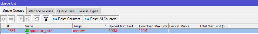 При использовании MikroTik с Simple Queue (dynamic), изменение скорости "на лету" приводит к изменению очереди на static (очередь test_net).