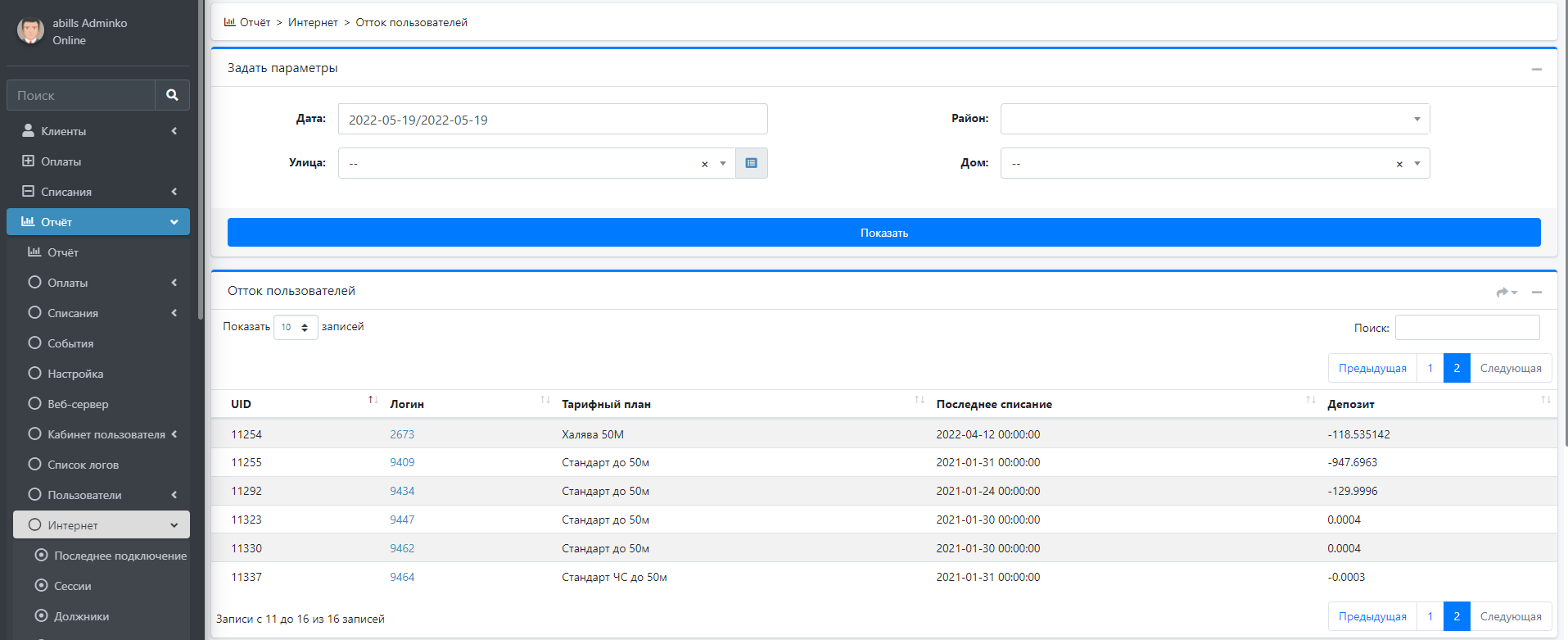 После списка пользователей отображаются диаграммы оттока пользователей по улице и домам.