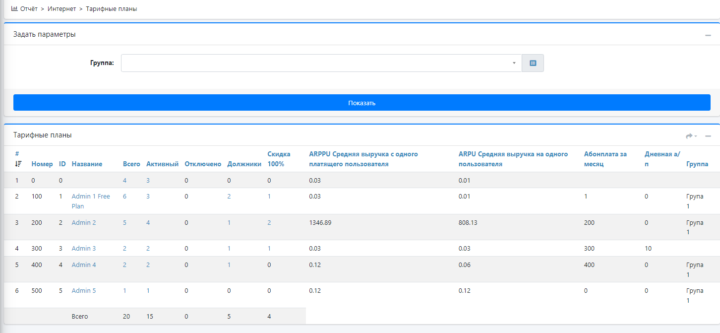 Фильтр "Группа" делает выборку абонентов по группе. Первая строке в отчете (ID=0) показывает количество абонентов без тарифного плана