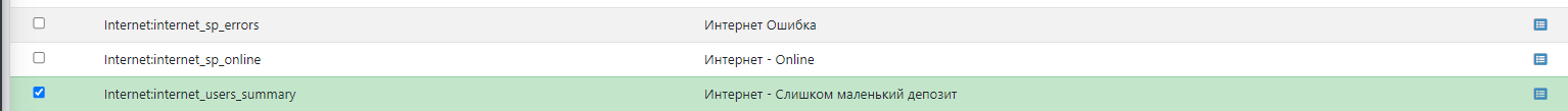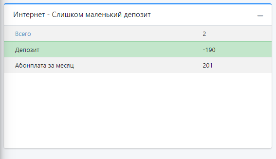 Отчет по Интернет - Слишком маленький депозит показывает количество абонентов, депозиты и абонплаты, у которых статус "Слишком маленький депозит" с переходом на детальный список абонентов