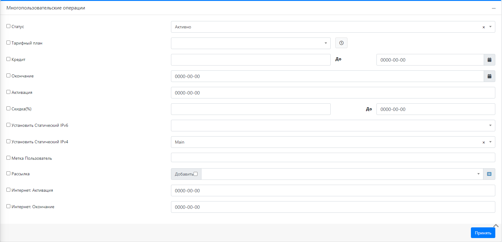 Система разрешает одновременно выполнять операции по изменению параметров нескольким сервисам. Для этой операции в списке пользователей Интернет предусмотрена панель Многопользовательские операции. В случае отсутствия панели добавьте права администратору (Настройка>Администраторы)