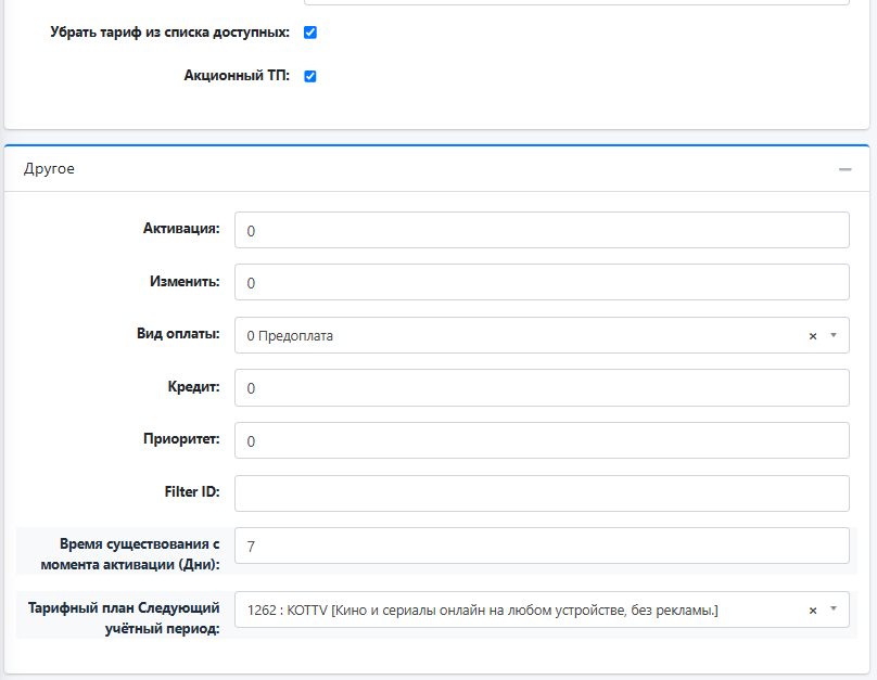 Настраиваем тариф аналогично предыдущему шагу, указываем тот же Filter-id, но цену 0;