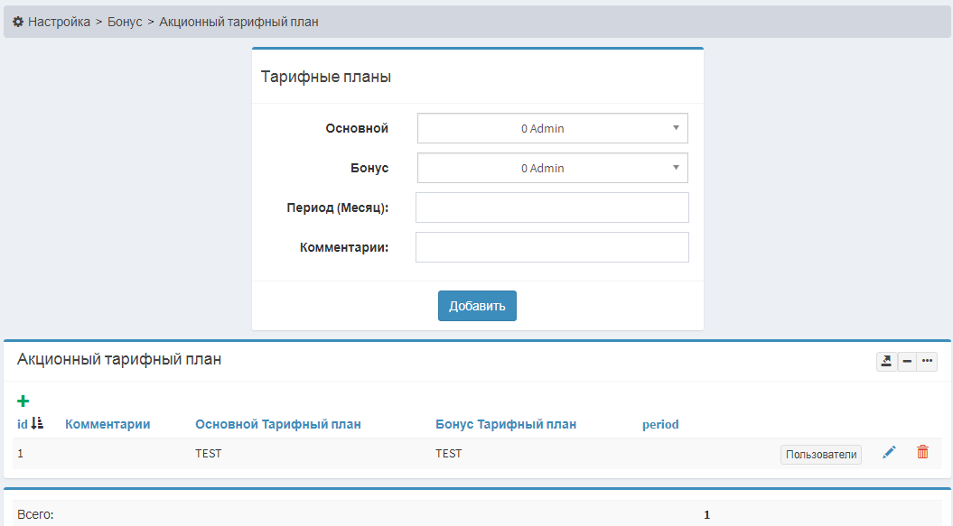 Меню Настройка>Бонус>Акционный тарифный план