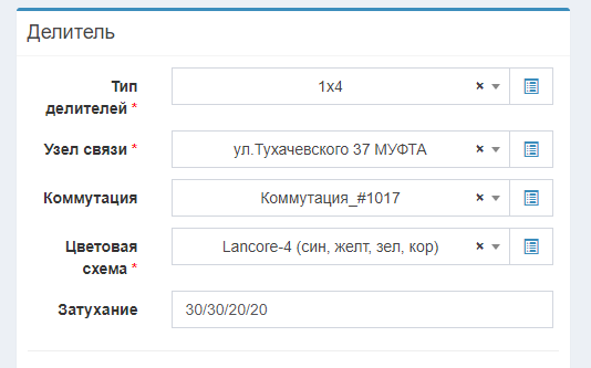 Имеется набор различных делителей и сплитеров для PONa. Все они имеют свою расцветку, которая может как отличаться, так и повторяться. Например, делитель 30/70 может иметь расцветку: вход – красный, 30% – желтый, 70% синий.