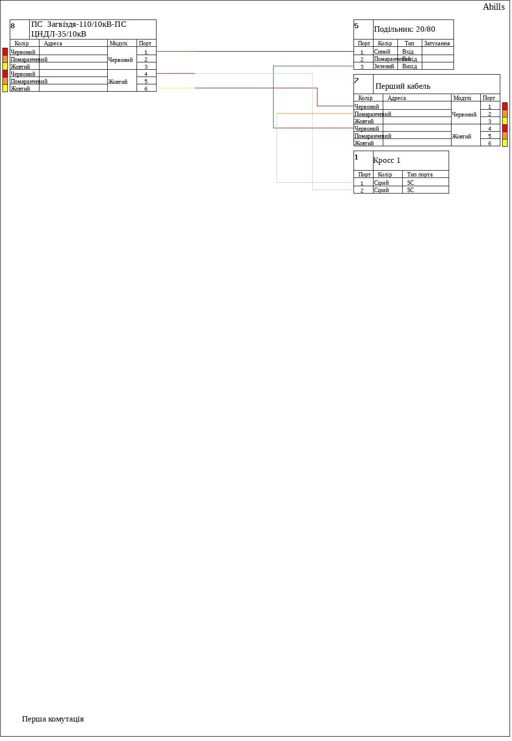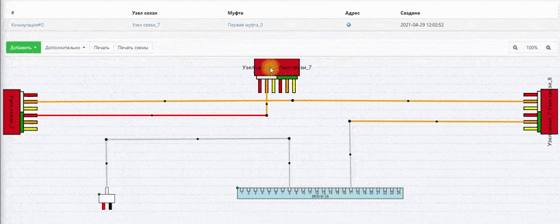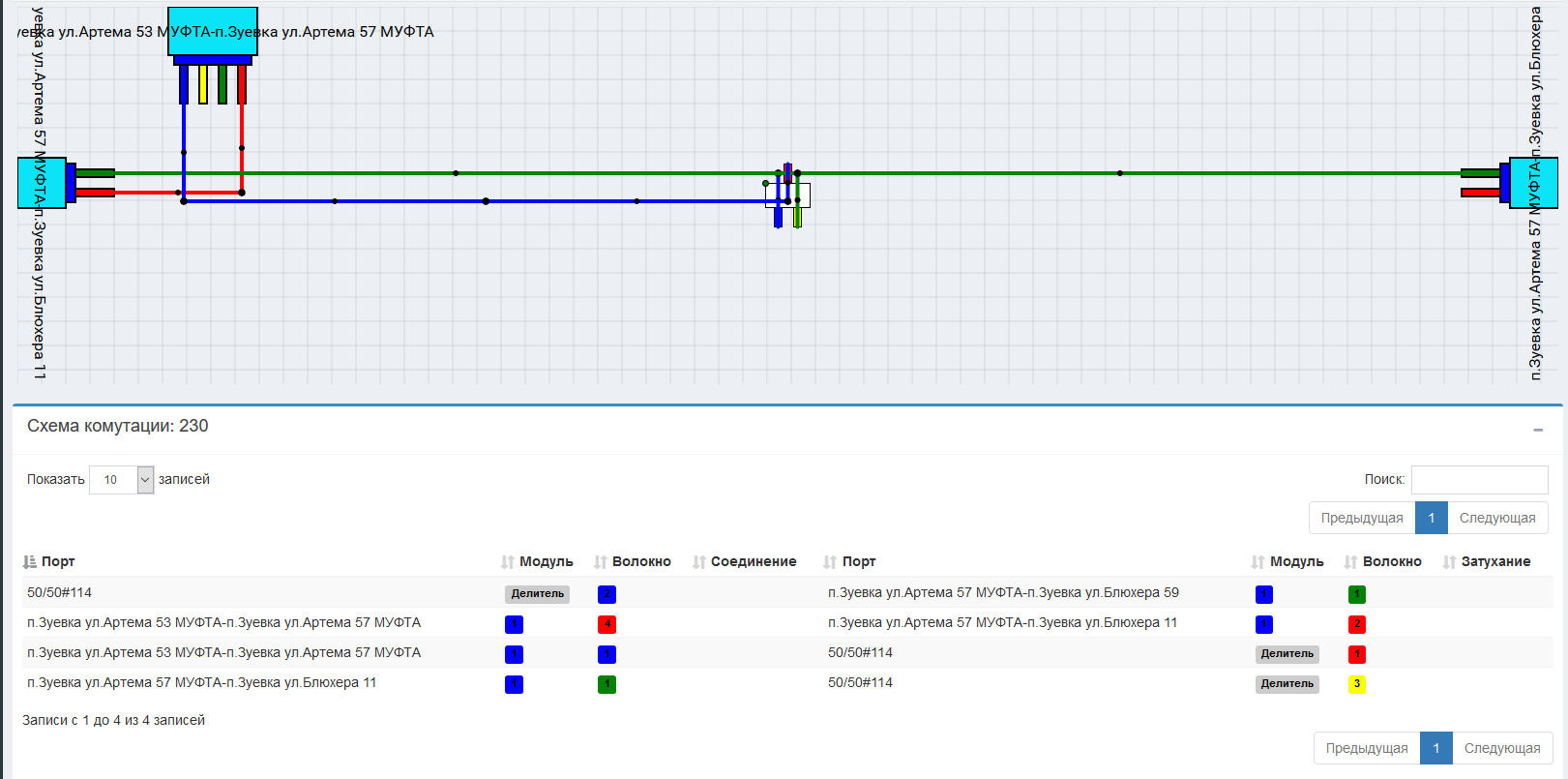 Схема коммутации волокон внутри муфт. Редактирование, просмотр и печать соединений, делителей, кросов и оборудования.