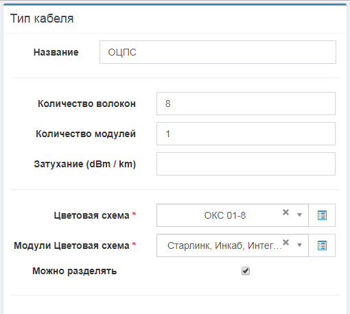 Метка на параметре Можно разделять - значит, что данный тип кабеля можно разделить и добавлять новые узлы связи соответственно. Если данный параметр не будет отмечен, соответственно, возможность добавления новых узлов связи будет не доступна.