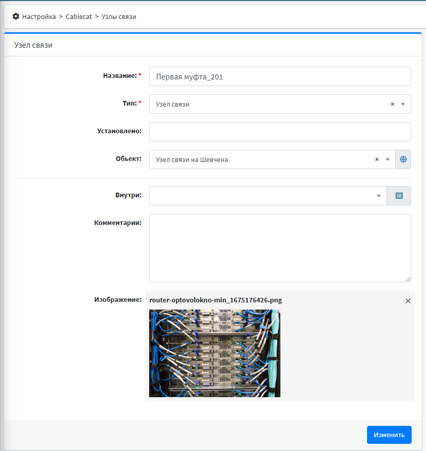Узлы связи содержат муфты и связаны кабелями с другими узлами связи. Отвечают за все типы узлов связи (колодцы, ящики, клиентское оборудование). Узлы связи имеют собственную иерархию (ящик внутри ящика и т.д.).