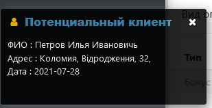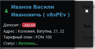 Пример вывода информации о звонящем абоненте, а именно его депозит, адрес, тарифный план и статус сервиса, который находится первым в списке сервисов. По щелчку переход на профиль абонента.