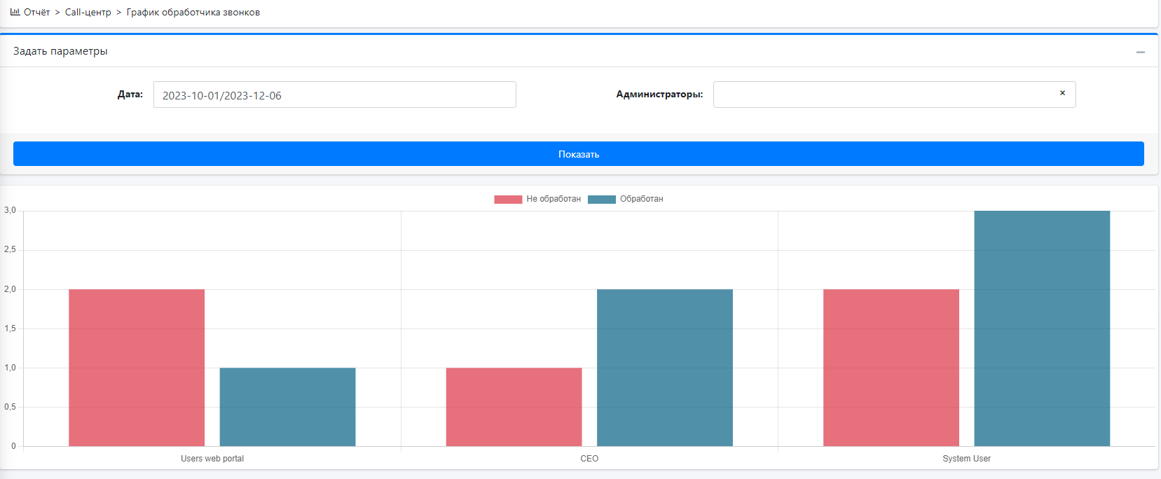 Откроется страница, где можно выбрать администраторов, тех у кого задан SIP номер, а также можем задать период времени. Если не заданы параметры - данные в график буду выведены за текущий месяц от 1 числа по всем администраторам.