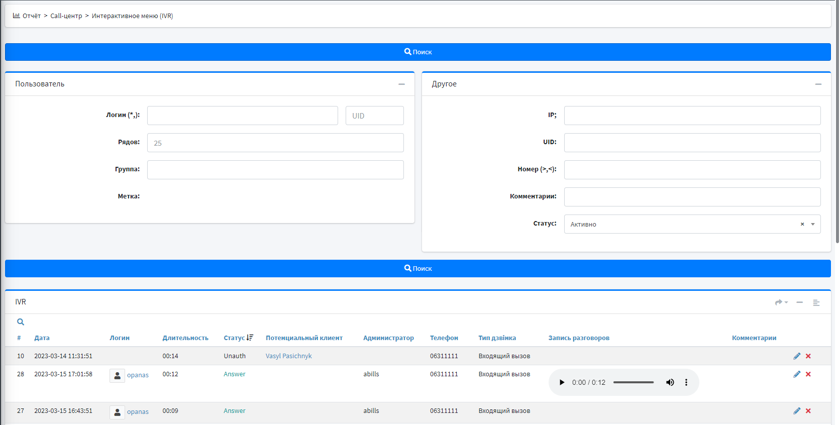 Меню Отчёт>Call-центр>Интерактивное меню (IVR)