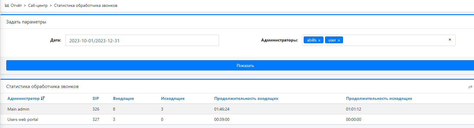 Отчет показывает количество входящих, исходящих звонков а также их продолжительность