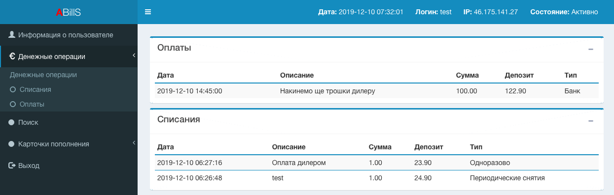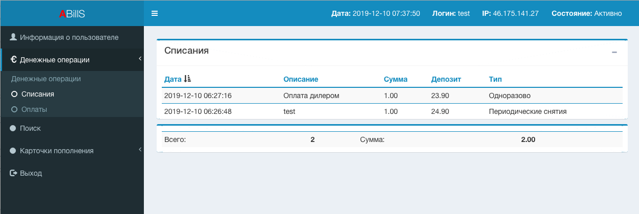 Для более подробной информации о списании средств дилера нужно зайти в Денежные операции → Списания