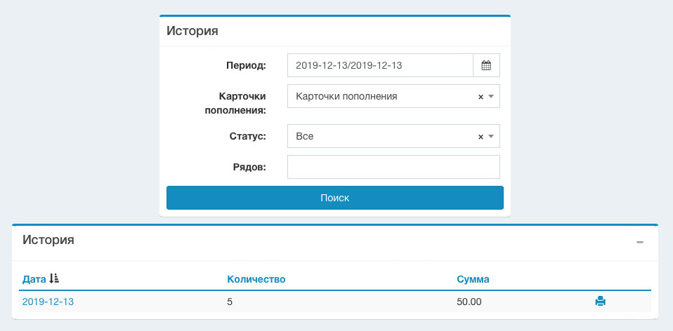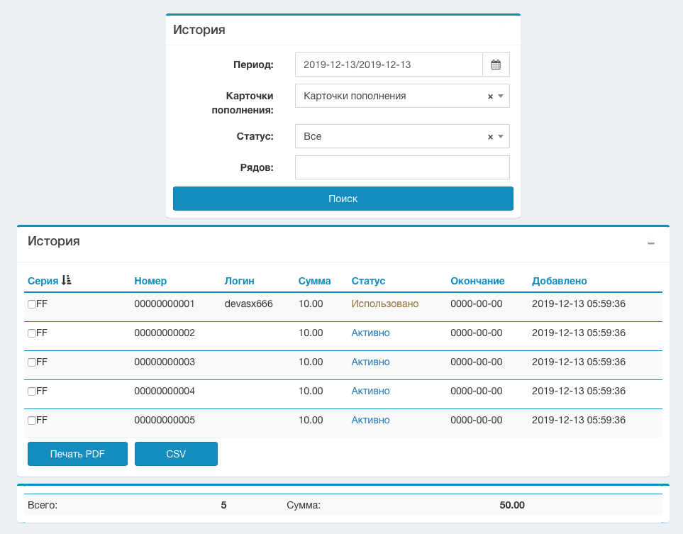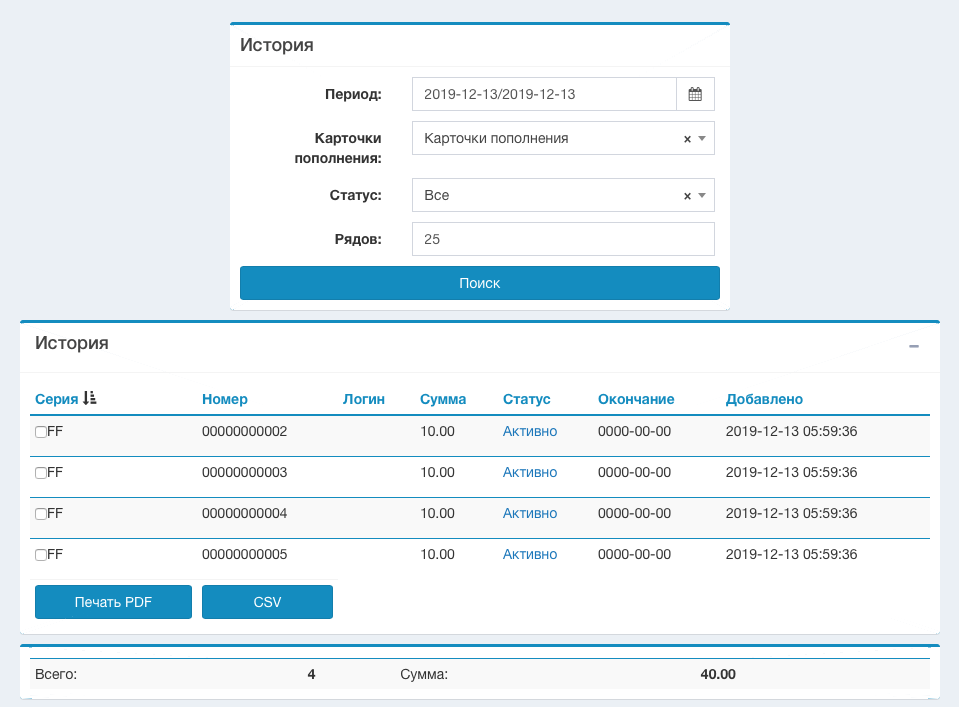 Дилер имеет возможность осуществить поиск по карточкам, проверить данные карточки, была ли она использована или нет. В данном меню есть возможность просмотреть общее количество карточек и общую сумму.