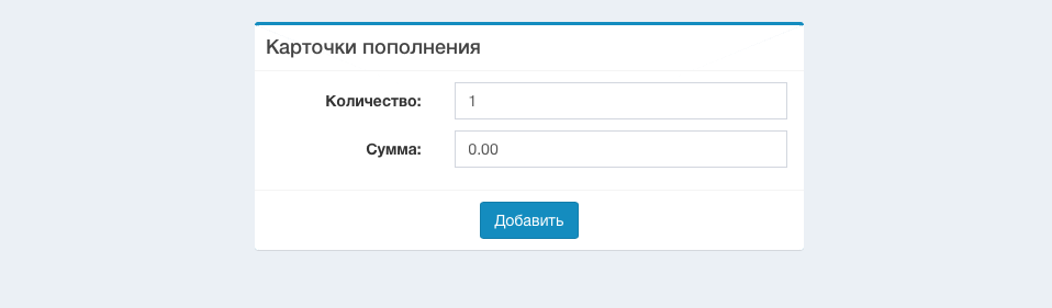 Дилер имеет возможность выпустить карточки пополнения, это можно сделать в Интерфейс дилера>Карточки пополнения Заполнить поля, и выпустить карточки