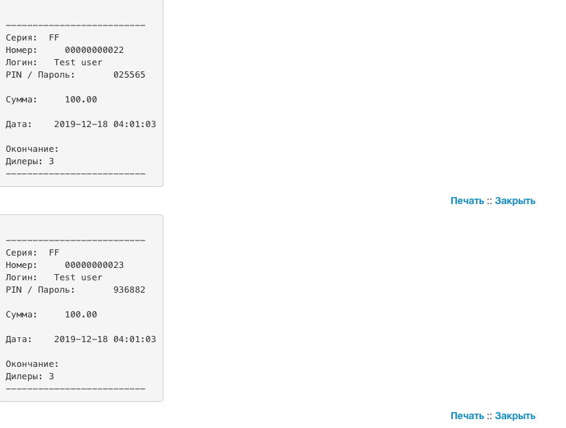 После того как дилер выпустил определенное количество карточек, он может их увидеть и распечатать