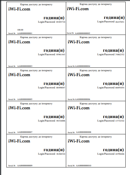 Также можно экспортировать уже созданные карточки в формат CSV. В файл экспорта заносятся следующие поля разделённые табуляцией: SERIAL LOGIN, PASSWORD/PIN, TARIF_PLAN, SUM, EXPIRE, AGE, TIME_LIMIT.
