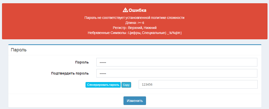 Для администраторов, при смене пароля, будет учитываться соответствие заданным в генераторе политикам сложности. Начиная с версии 0.75.121 можно включить проверку и для пароля клиента через переменную $conf{PASSWD_POLICY_USERS}.