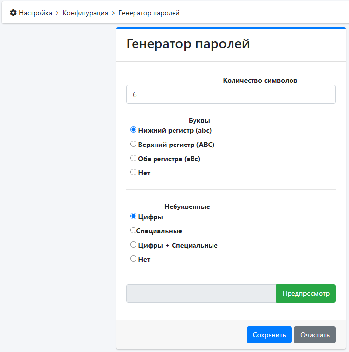 Настройка параметров генерации пароля через веб-форму.