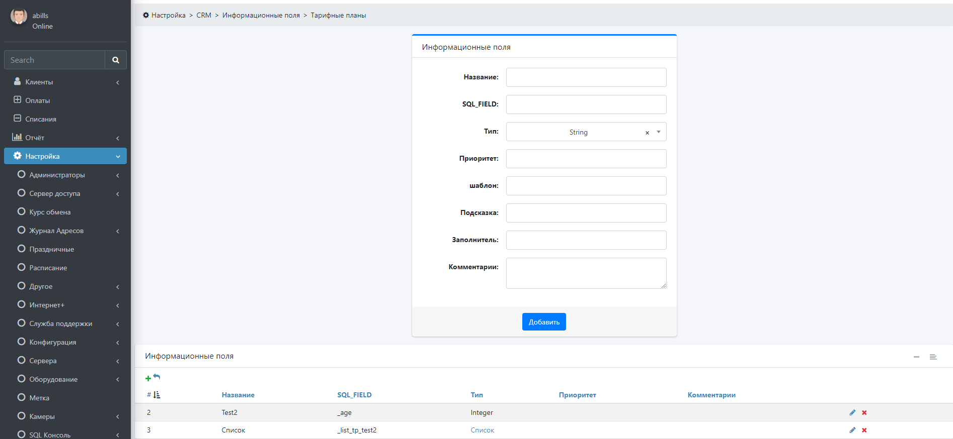 Набор функций по созданию дополнительных информационных полей для потенциальных клиентов и тарифных планов. Разрешает создавать дополнительные поля без вмешательства в код системы.