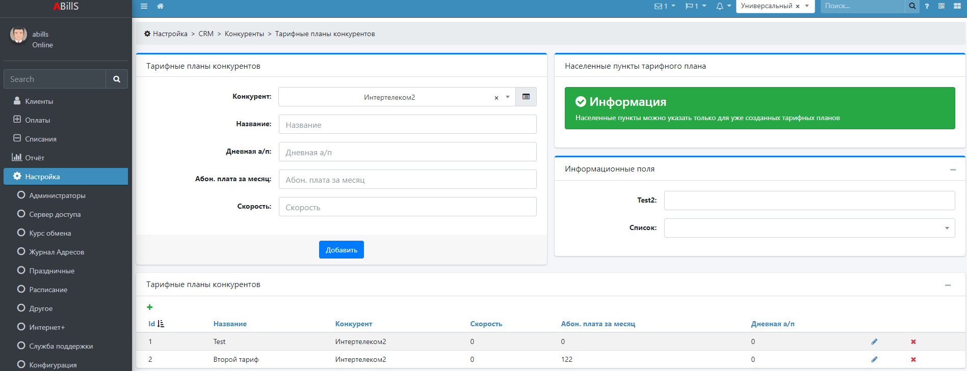 После создания информационных полей их можно заполнить для каждого потенциального клиента в меню Настройки → Crm→ Конкуренты → Тарифные планы