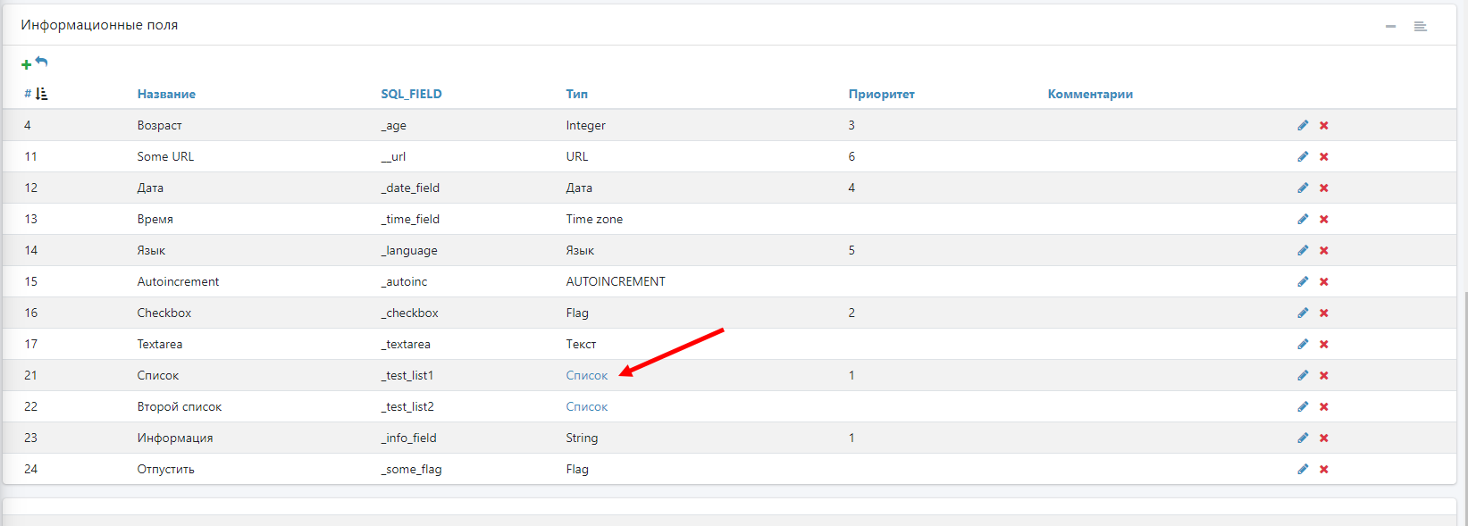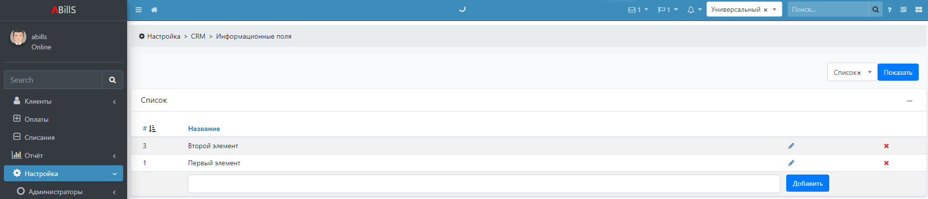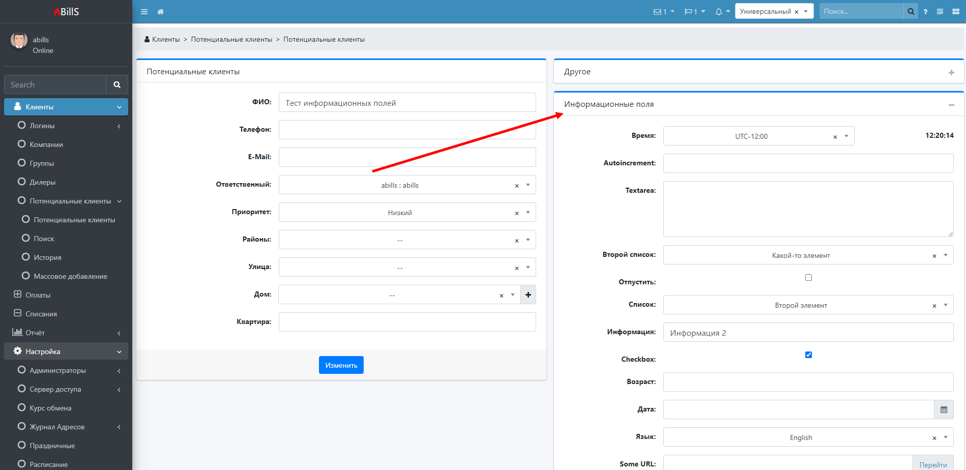 После создания информационных полей их можно заполнить для каждого потенциального клиента в меню Клиенты → Потенциальные клиенты → Потенциальные клиенты