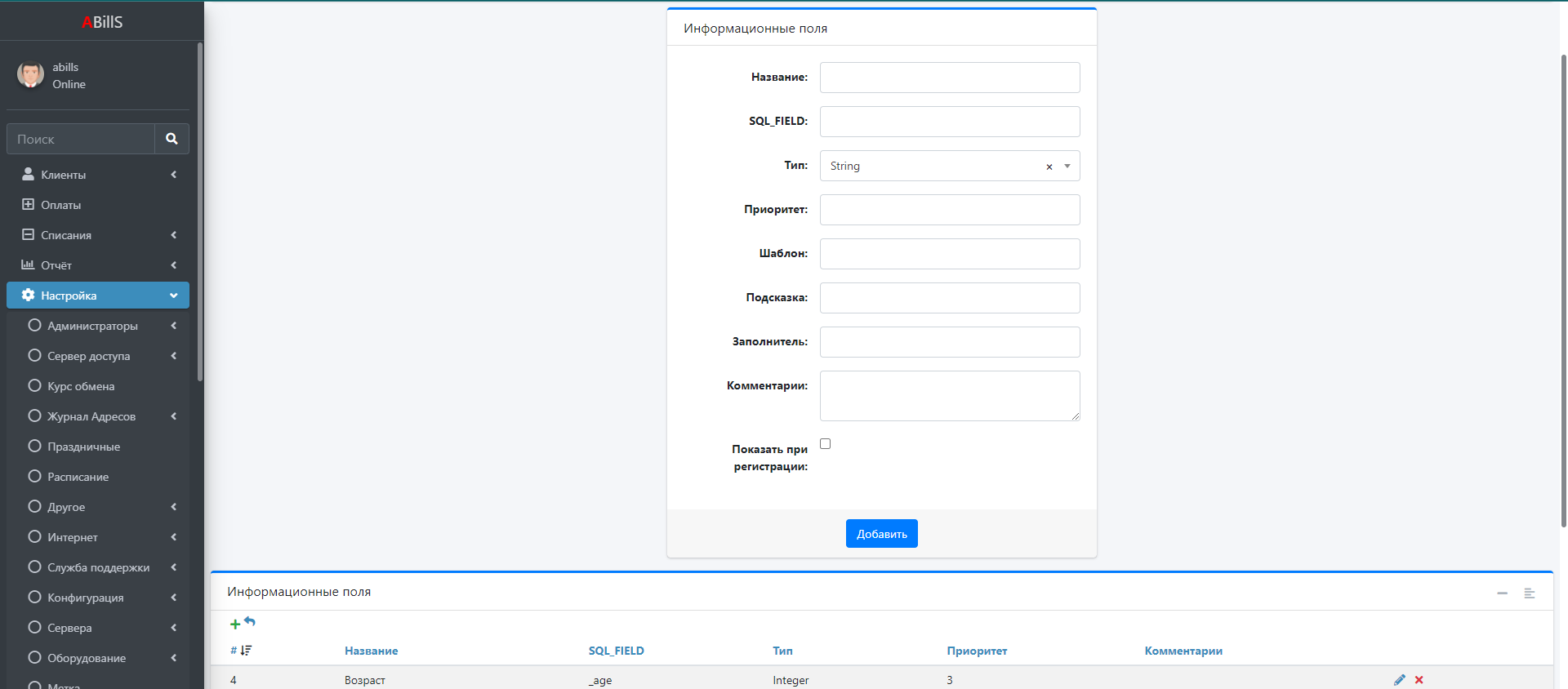 - Показать при регистрации - отображать это поле при регистрации абонента