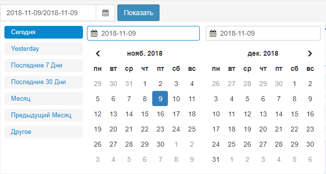 Также, есть возможность просматривать Воронку продаж за желаемый период. Для этого добавлен фильтр по дате, где вы можете выбрать нужный вам период. Нажать на поле ввода даты и появится окно для выбора. После выбора нужного периода нажимаем на кнопку Показать. По умолчанию Воронка продаж отображается за текущий месяц.