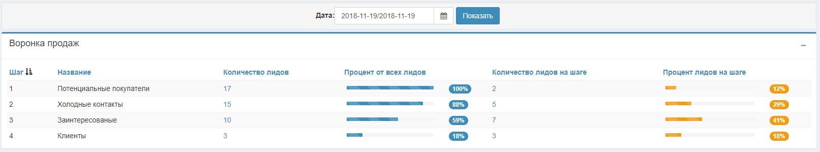 | Процент от всех лидов | В данной колонке отображается процент от всех лидов, которые прошли определенный шаг |