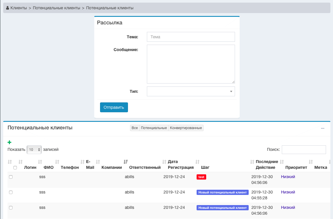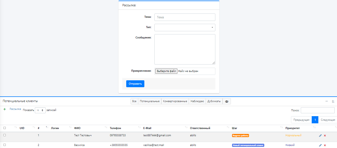 Для рассылки сообщений следует выбрать одного или несколько потенциальных клиентов, заполнить поля Тема и Сообщение, после чего нажать кнопку Отправить.