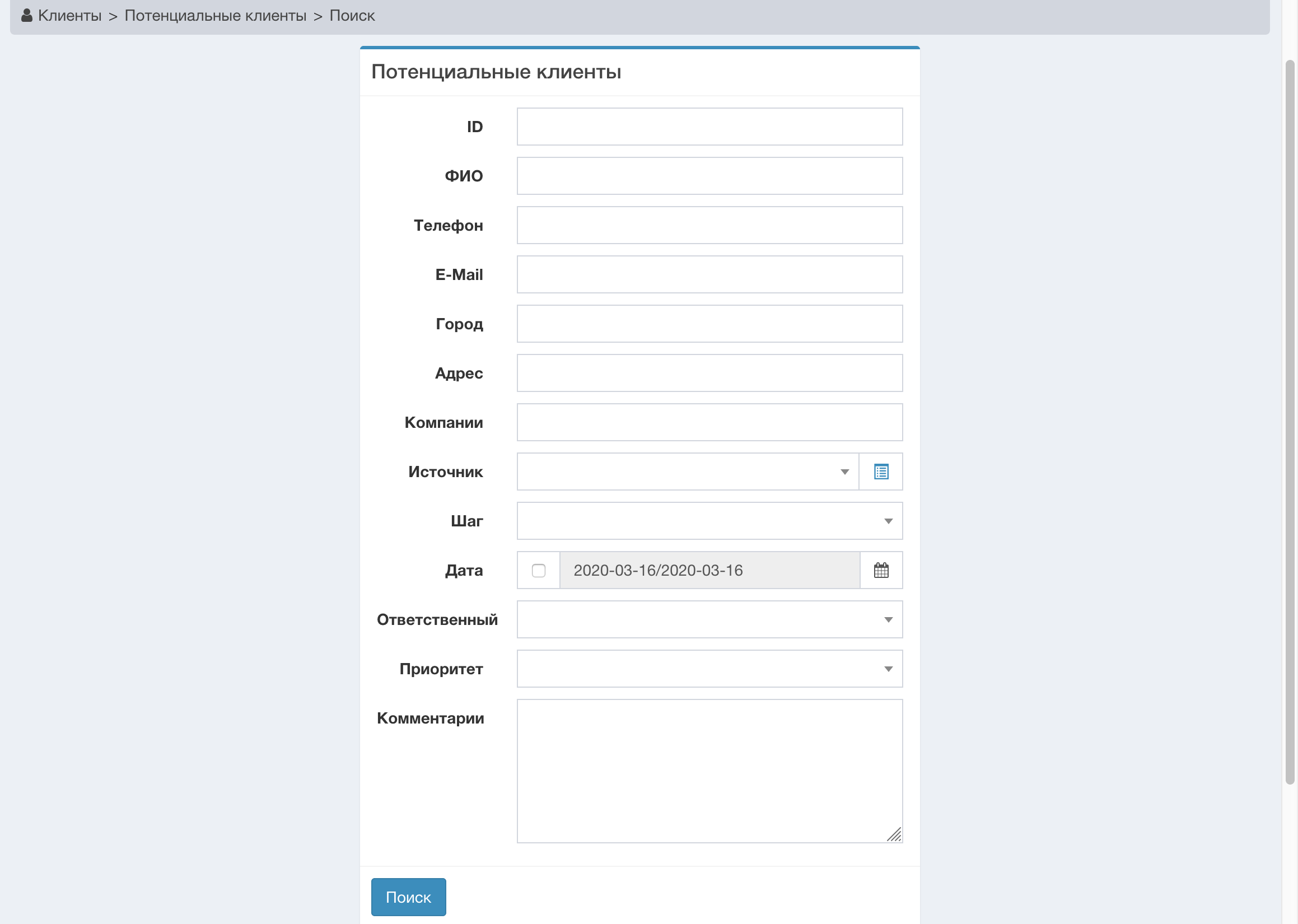 Второй - заходим в меню Клиенты>Потенциальные клиенты>Поиск. Видим форму с полями, по которым можно начать поиск.