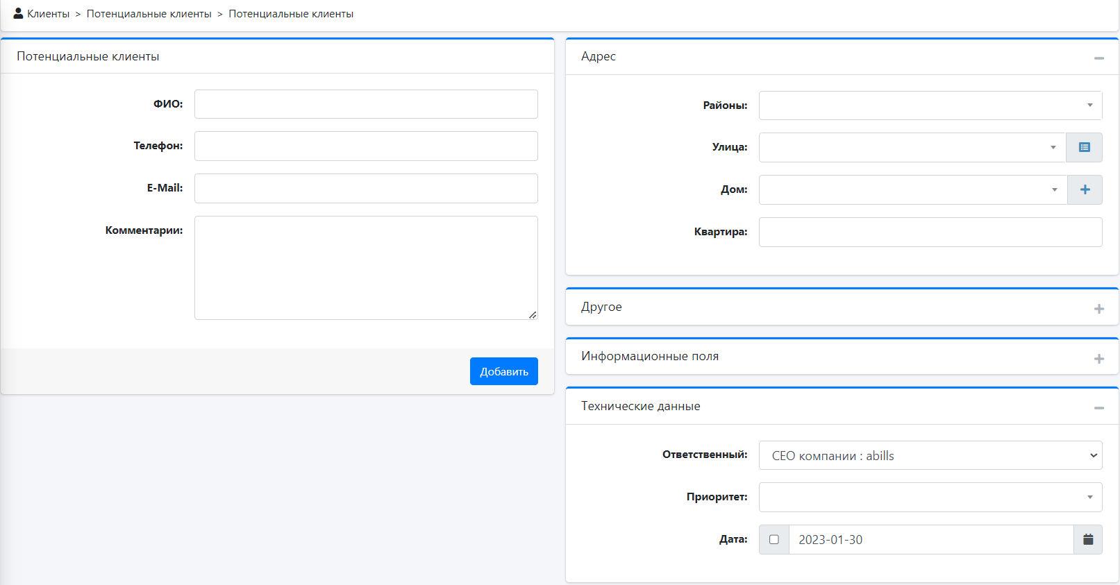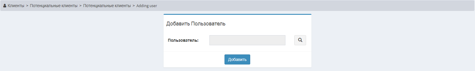 Для добавления нового потенциального клиента, нужно нажать кнопку Плюса в таблице "Потенциальные клиенты". Отобразится следующая форма добавления клиента, которую мы заполним и нажмем кнопку Добавить: