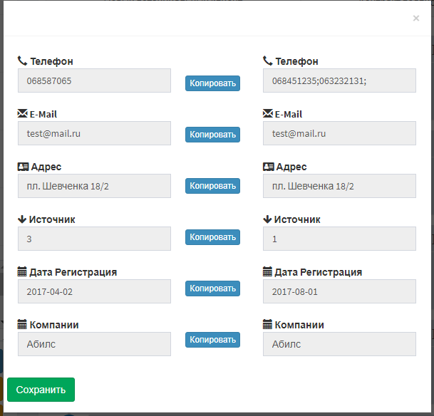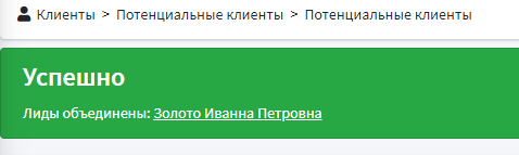 Нажатие кнопки Копировать будет переносить информацию с левого потенциального клиента в информацию к правому.