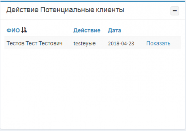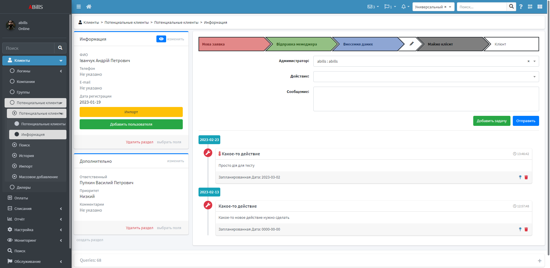 После нажатия кнопки Карандаш, мы увидим полную информацию о клиенте и прогресс работ для конвертации потенциального клиента в пользователя. По-умолчанию открывается общий список действий, комментарием и задач.