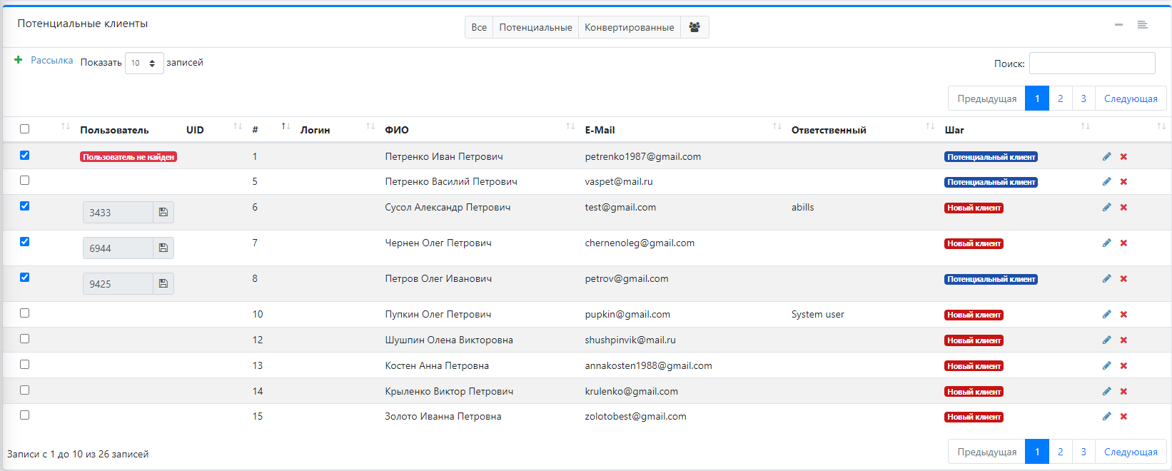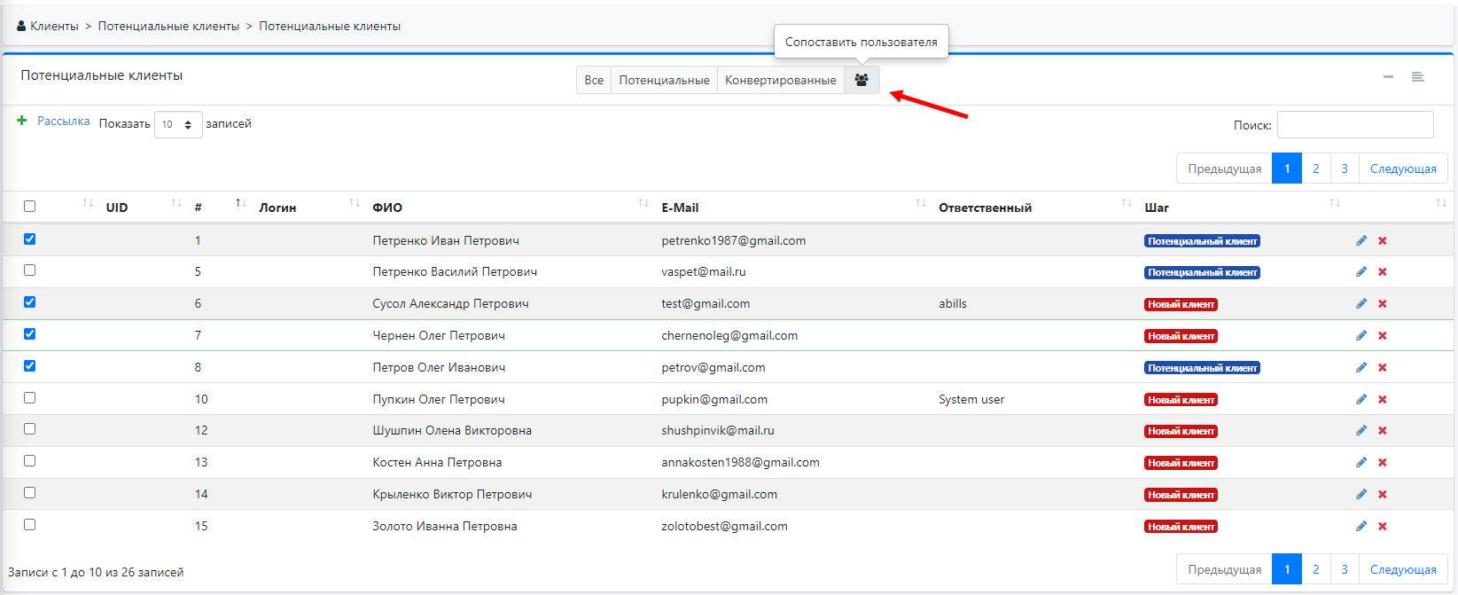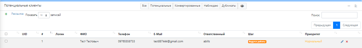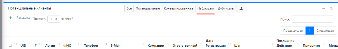 Если нажать на кнопку , то в текущего клиента добавится наблюдатель. Чтобы просмотреть всех клиентов, за которыми следит администратор, нужно перейти в список "Потенциальные клиенты" и нажать на кнопку