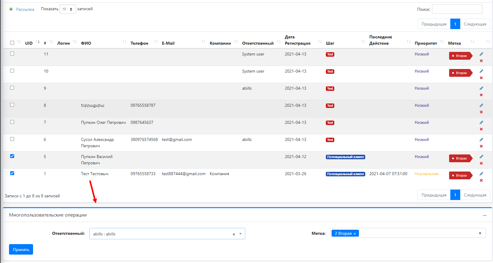 После чего в таблице появится колонка с результатами и возможностью прикрепить лида к пользователю.