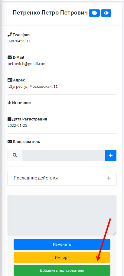 Нажмите кнопку Добавить и перейдя назад на страницу потенциального клиента, в информации появится кнопка перехода на пользователя.