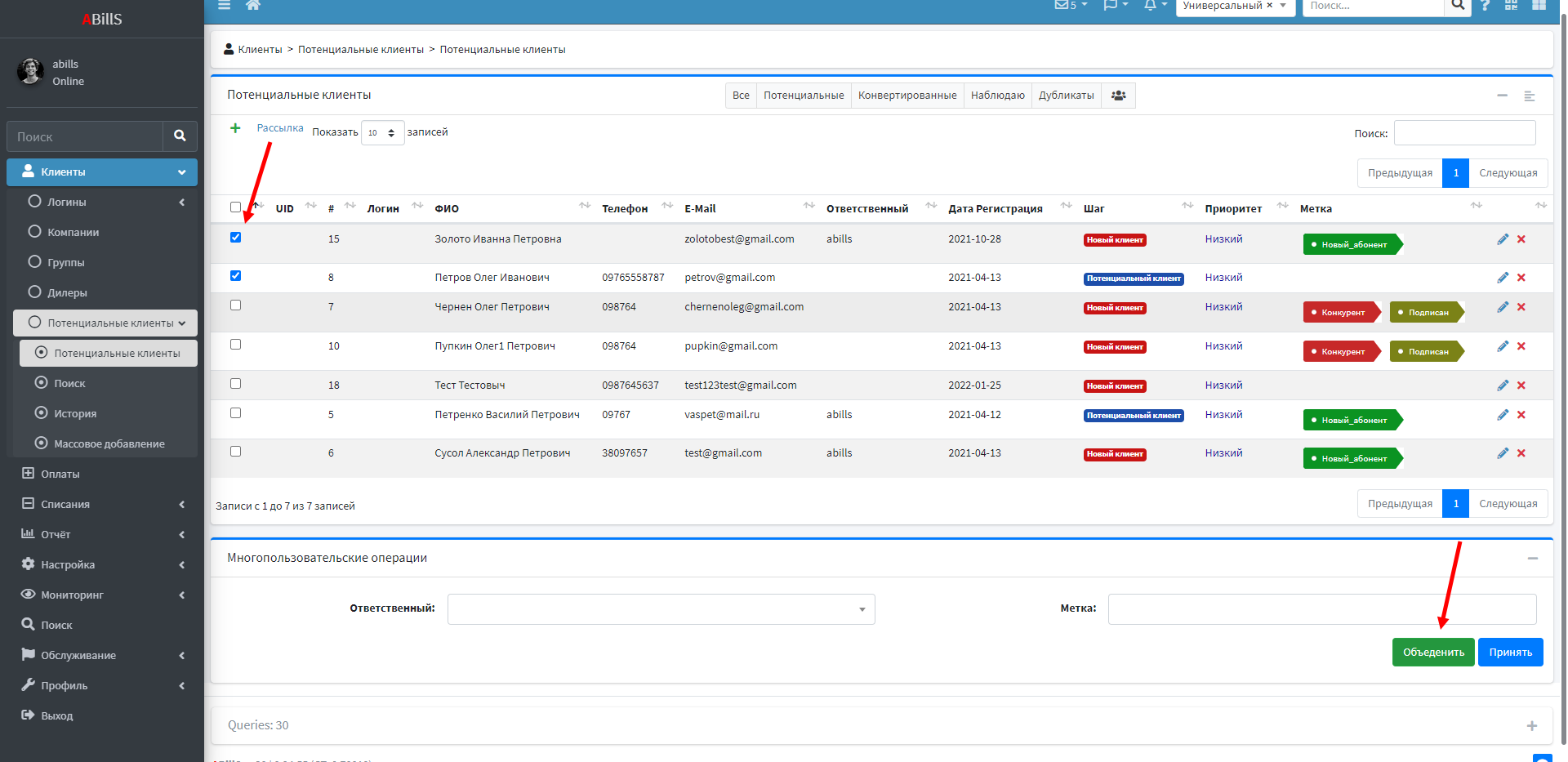 Позволяет объединять несколько потенциальных клиентов (в том числе и диалоги)