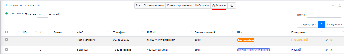 Для того, чтобы сделать поиск одинаковых лидов, которые были созданы с одинаковыми телефонами или е-мейлами, нужно нажать на кнопку "Дубликаты"