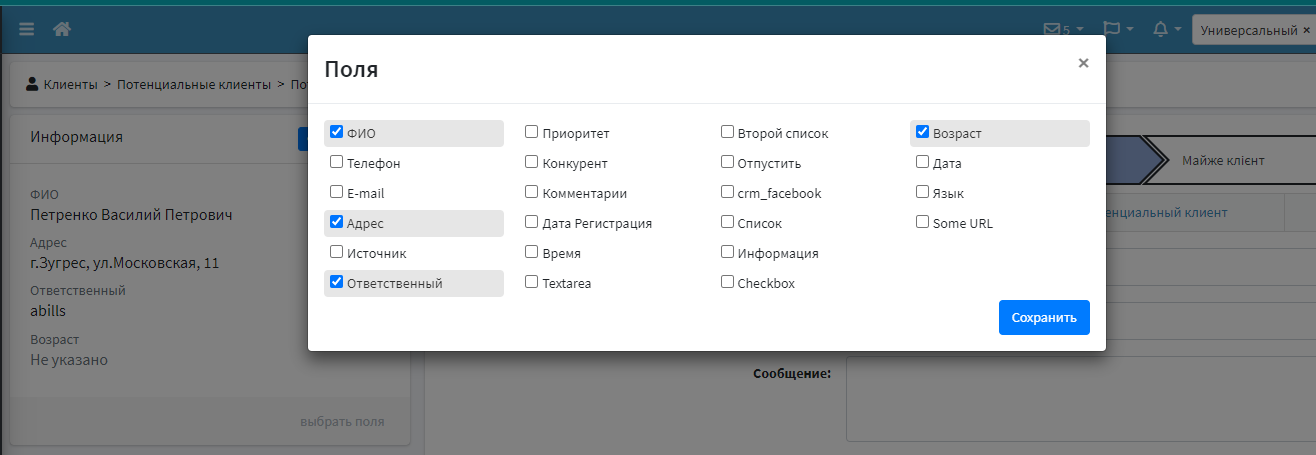 Появится модальное окно с возможностью выбора нужного потенциального клиента.