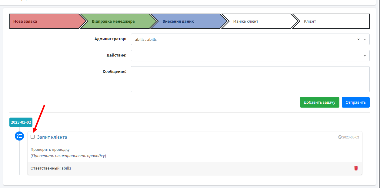 Так же можно добавлять заметки или действия к каждому шагу у потенциального клиента. Разделение идет следующим образом: если это только текст в текстовом поле без выбора Действия/Администратора/Запланированной даты - это заметка, в ином случае это действие.
